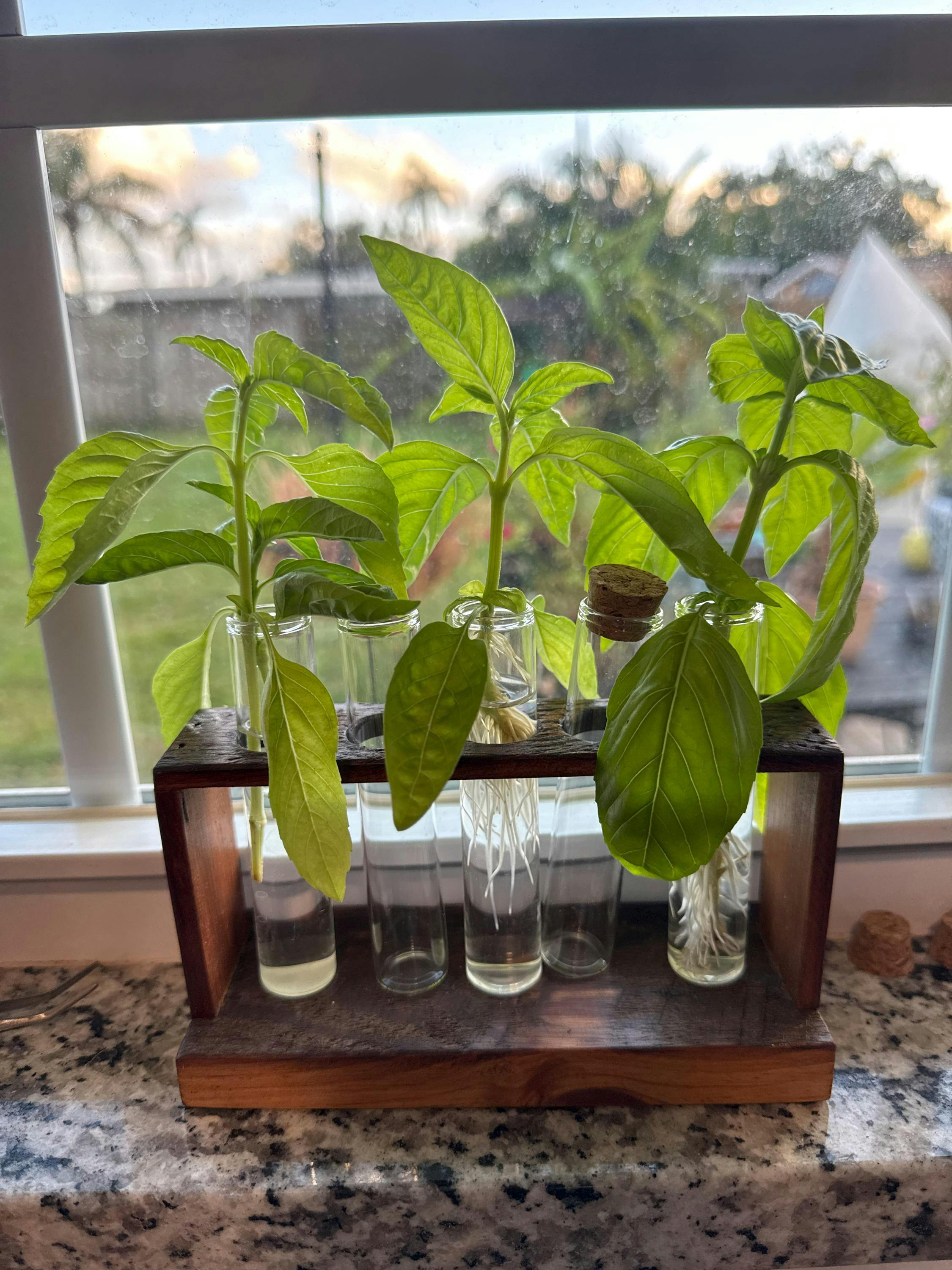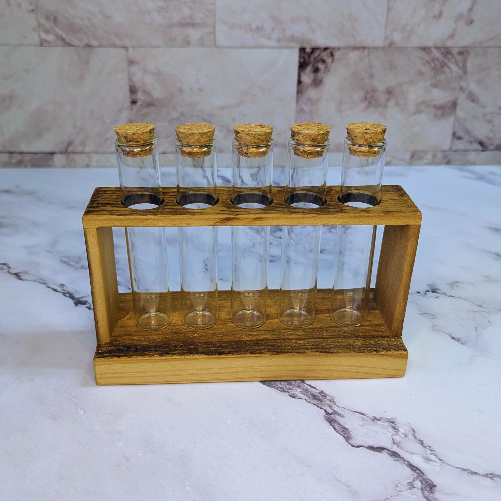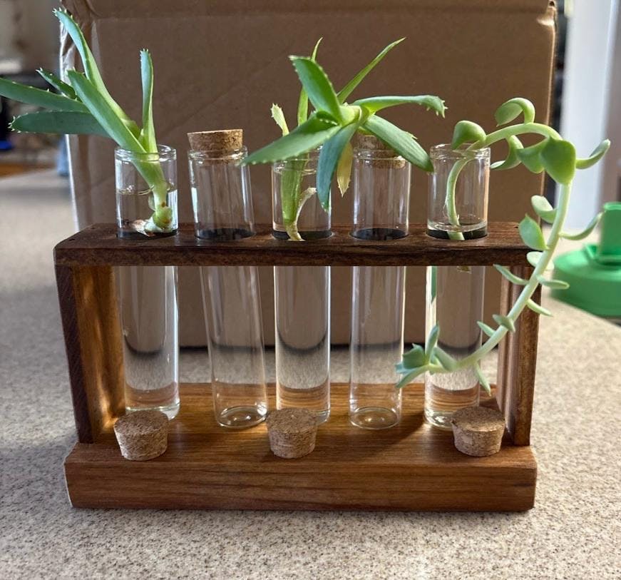 This reclaimed wood plant stand comes with 5 glass test tubes with cork stoppers. It's perfect for plant propagation or for use as a unique vase. It works well in small spaces and is a beautiful addition to any table or counter. This also makes a wonderful gift for the plant person in your life! Each stand is handcrafted from reclaimed wood and, as a result, each one comes with unique wood grain, knots and markings. One finish option is a dark stain similar to walnut and the other is a clear finish over the natural wood that gives the wood a honey tone. Happy planting!