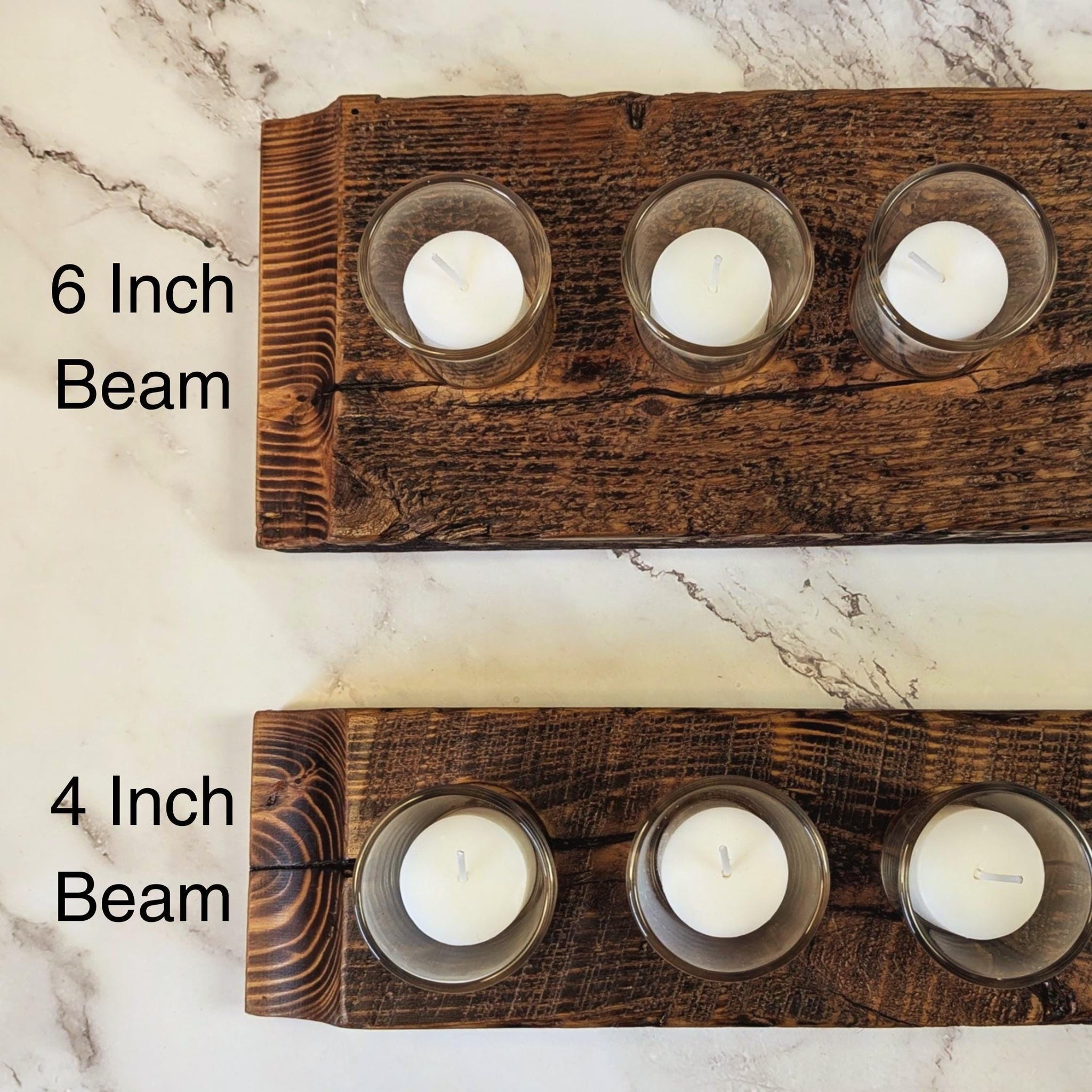 This reclaimed wood candle centerpiece is hewn from a barn wood beam and fitted with 10 clear glass votives and ivory candles. It is the perfect centerpiece for your table or fireplace mantle. Its warm wood and rustic nature help bring a cozy atmosphere to any space. The votives and candles are removable to suit your personal preference. The votives used are 2 inches in diameter and a natural finish is used on the candle holder to bring out the wood grain. You have the option to choose from a 4 inch or 6 inch wide beam for your centerpiece. Each beam is unique and comes with its own natural marks, cracks, nail holes, and/or joinery marks/holes from decades of use.